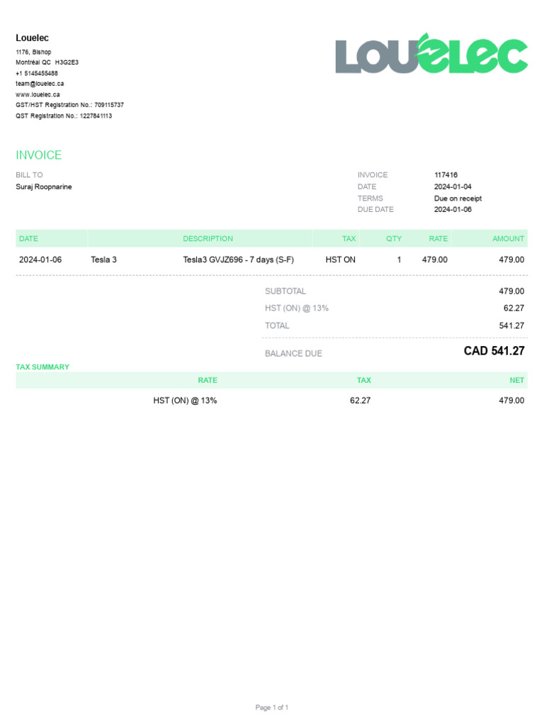Louelec Invoice for Tesla 3 Rental | PDF