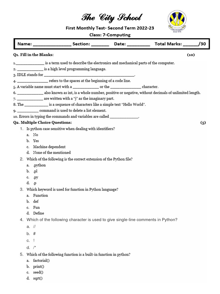 Python Test Class 7 | PDF | Python (Programming Language) | C ...