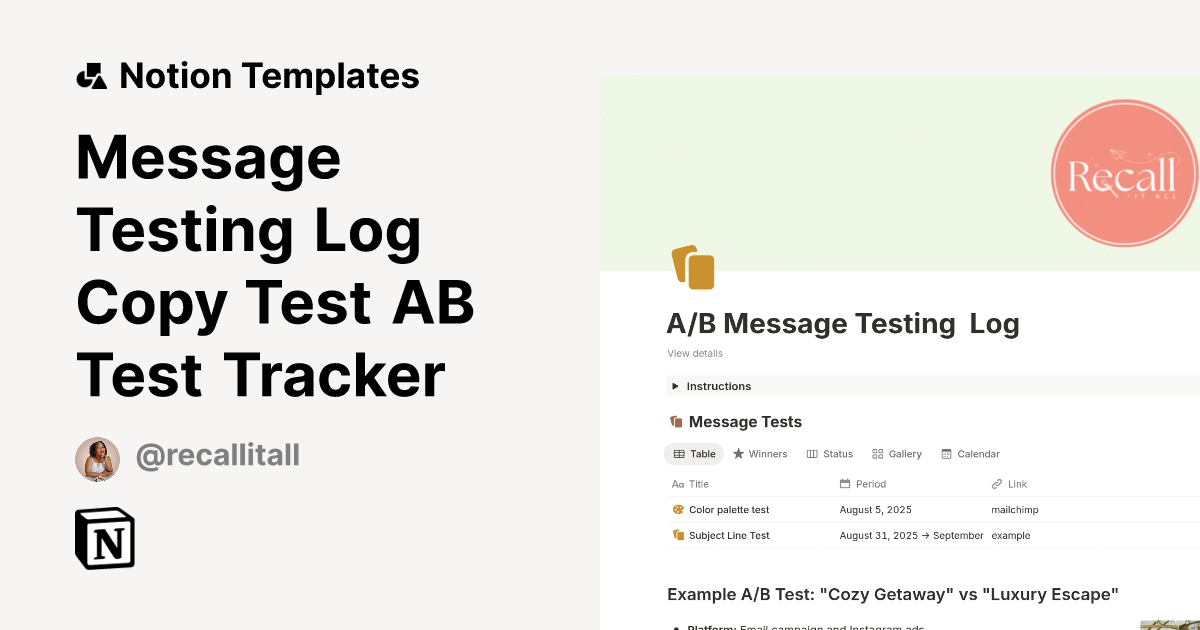 Message Testing Log Copy Test AB Test Tracker Template | Notion Marketplace