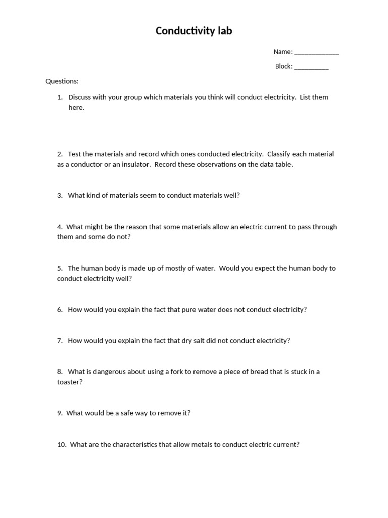 Testing Electrical Conductivity of Materials Investigation Instruction ...
