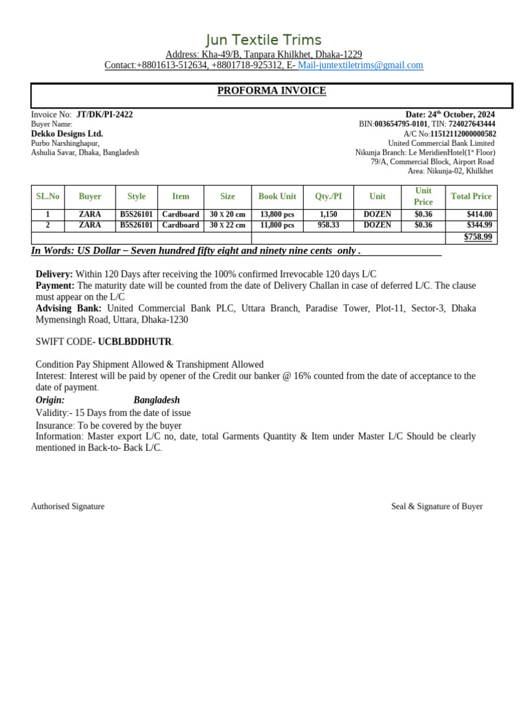 Jun Textile Trims: Proforma Invoice | PDF | Banking | Financial Services