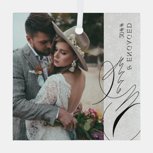 Engaged Modern Script Couples Photo & Monogram Glass Ornament | Zazzle