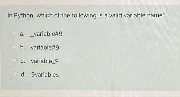 Solved Which one is a Valid variable name in Python? Select | Chegg.com