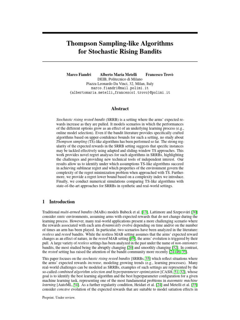 Thompson Sampling-Like Algorithms For Stochastic Rising Bandits | PDF ...