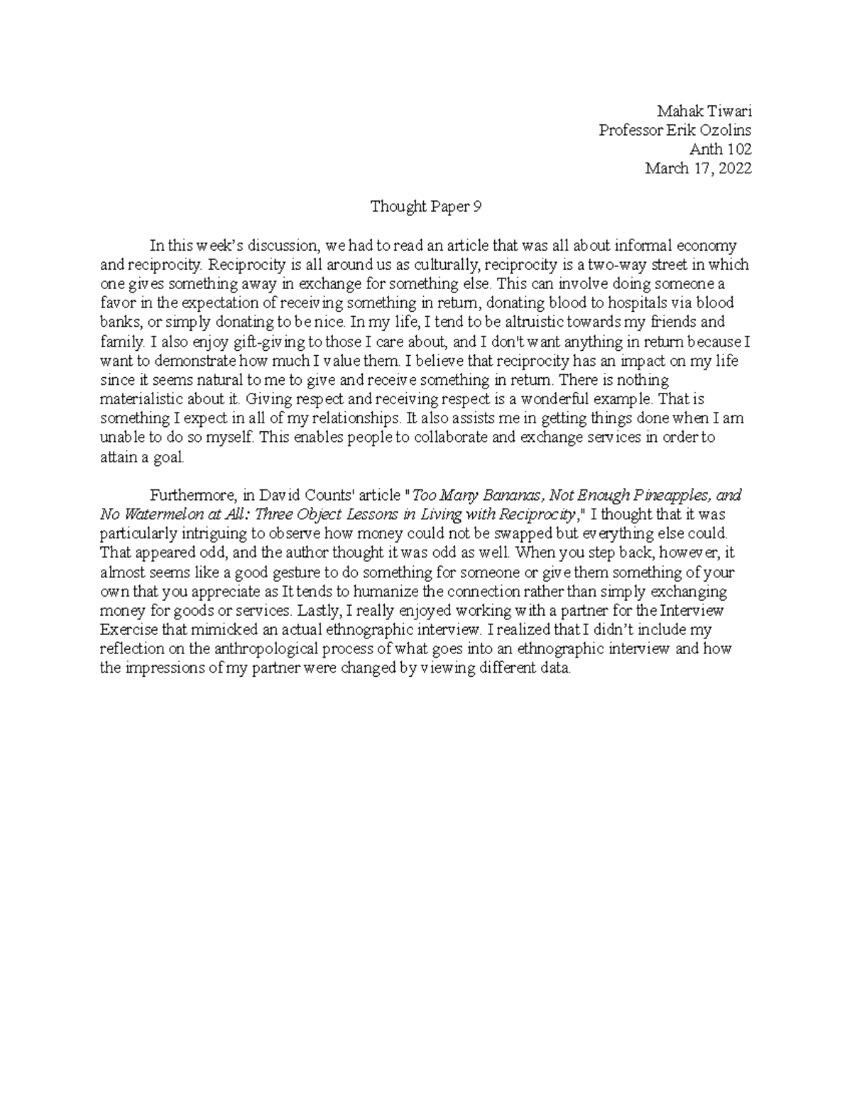 TP 9 MT - Thought Paper 9 - Mahak Tiwari Professor Erik Ozolins Anth ...
