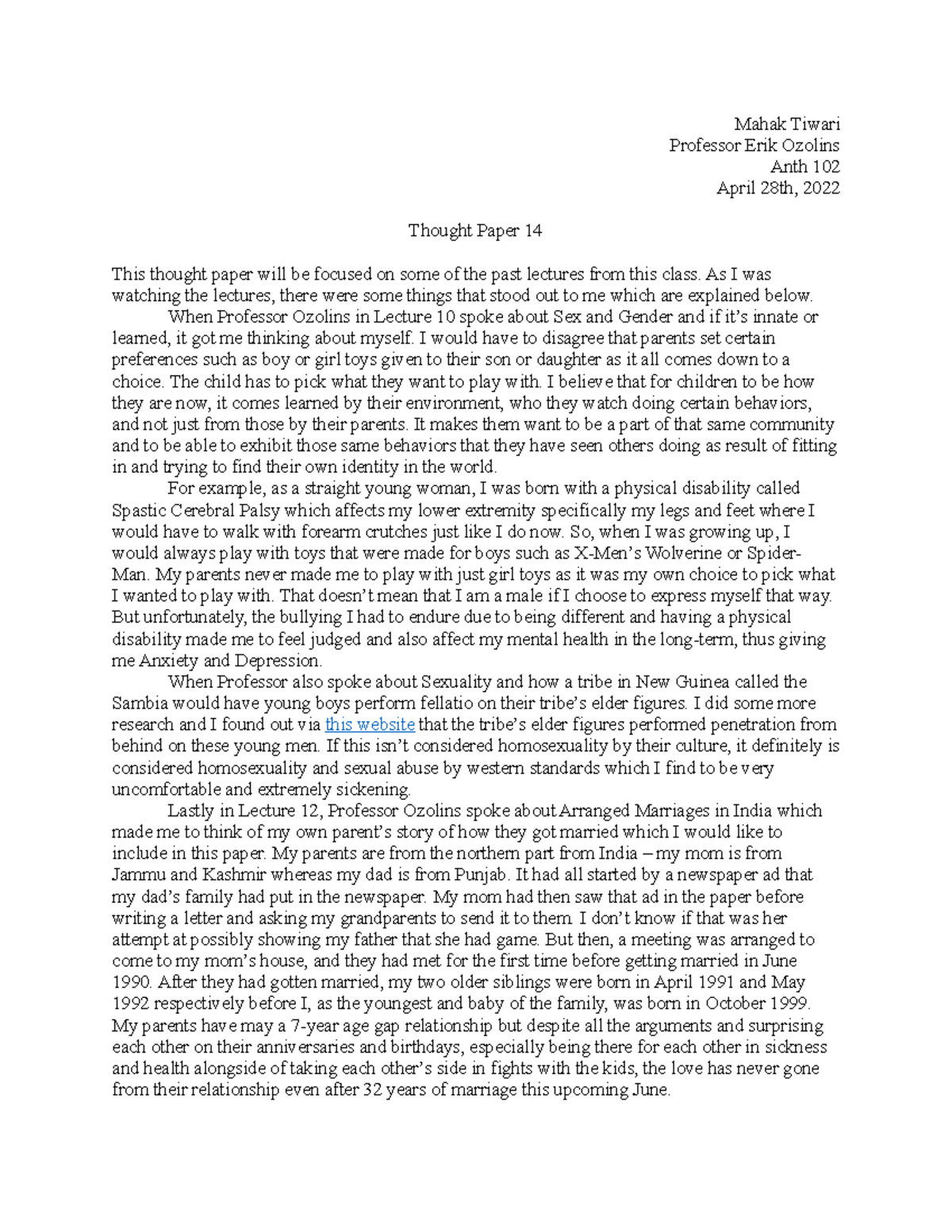 TP 14 - Thought Paper 14 - Mahak Tiwari Professor Erik Ozolins Anth 102 ...