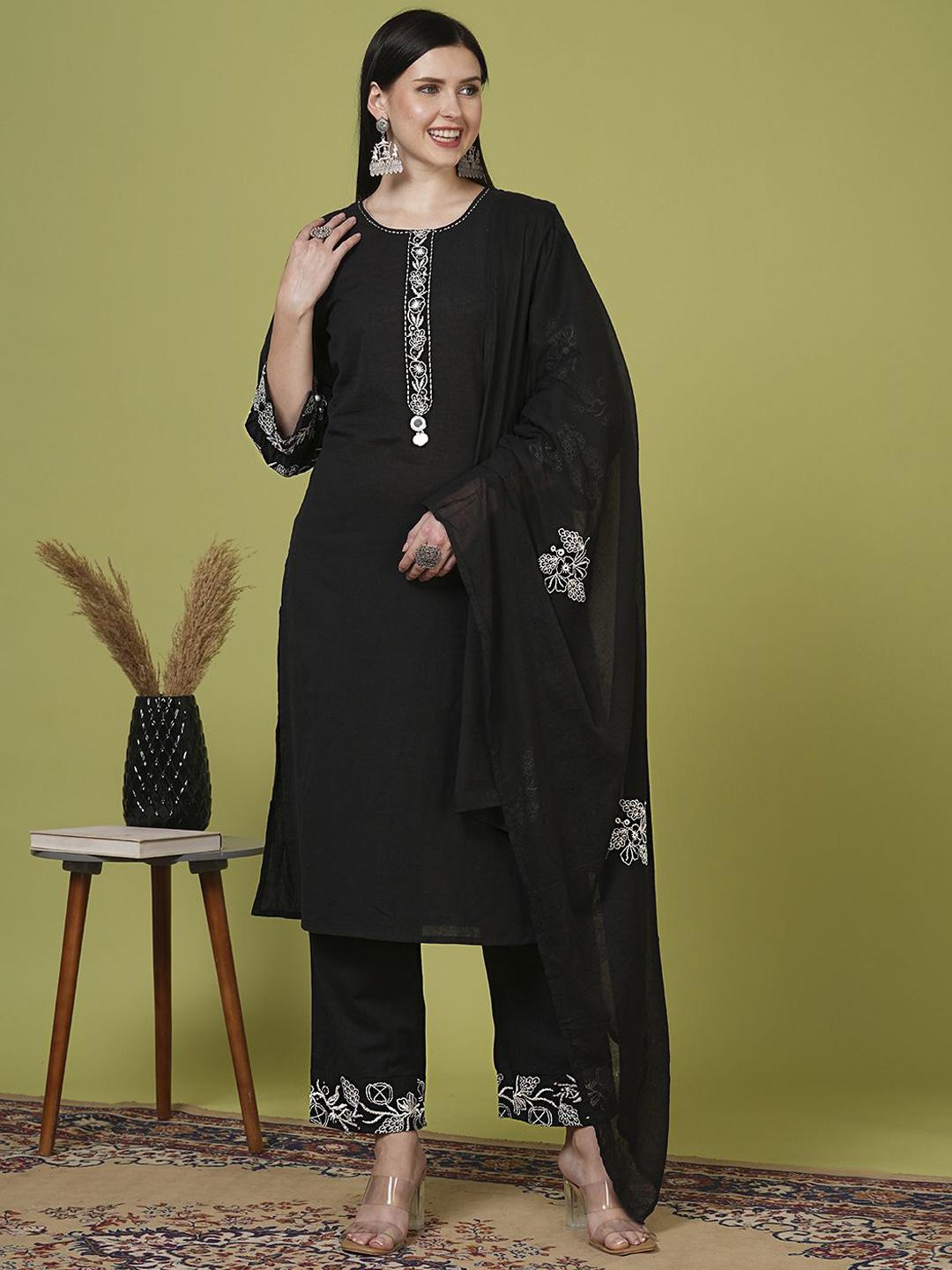 Buy FASHOR Floral Yoke Design Thread Work Pure Cotton Kurta With ...