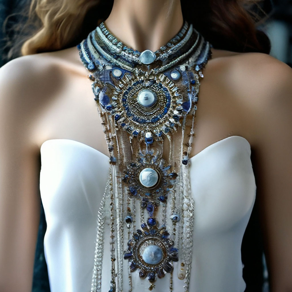 "Long elaborate neck ornaments, many levels. long thin threads, chains ...