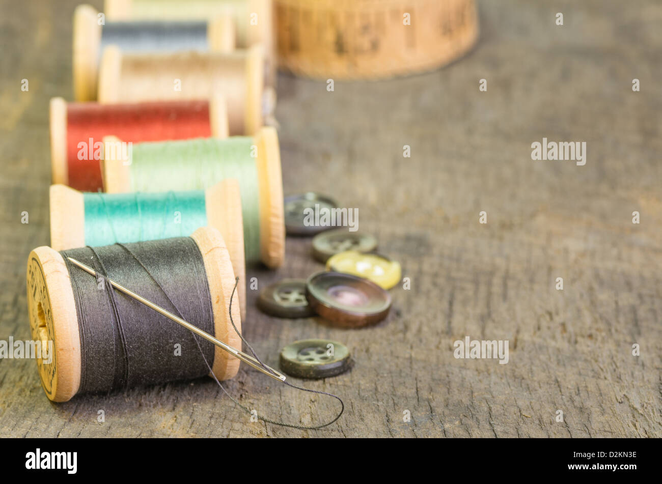 Sewing thread on spools with needle and buttons Stock Photo - Alamy