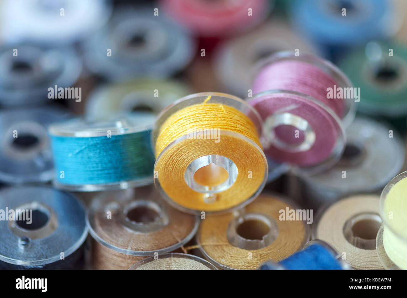 Close-up on colored sewing threads on spools Stock Photo - Alamy