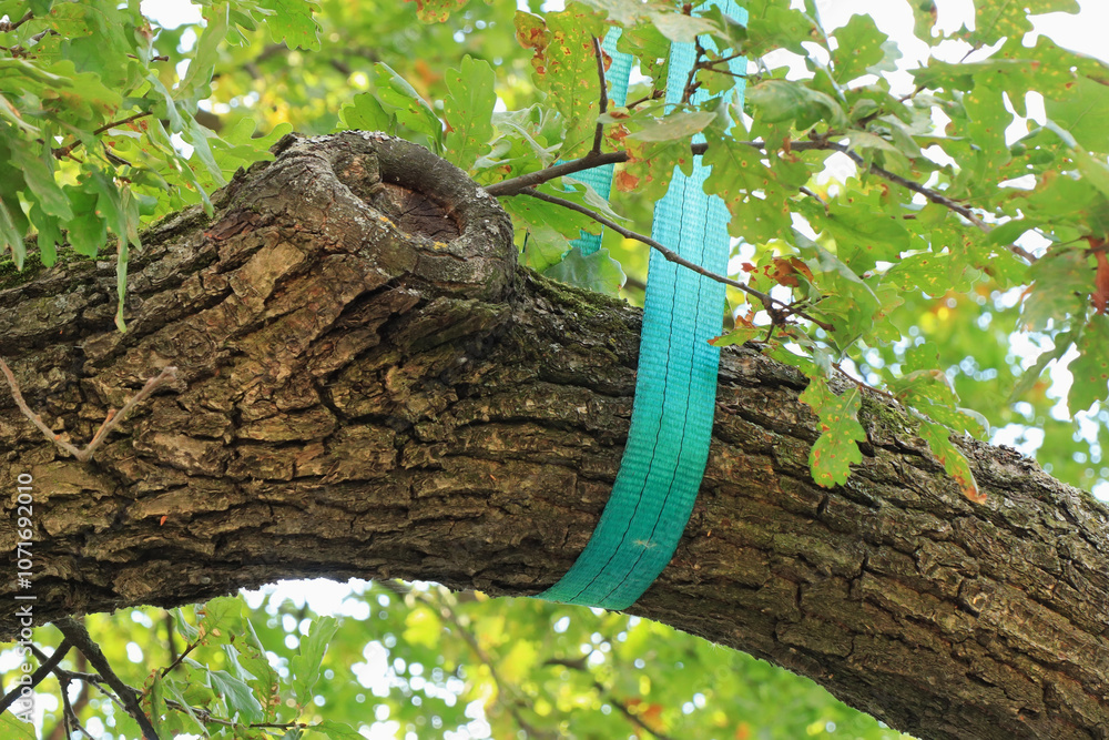 Large tree branch tied with a belt. Strengthening an old oak tree ...