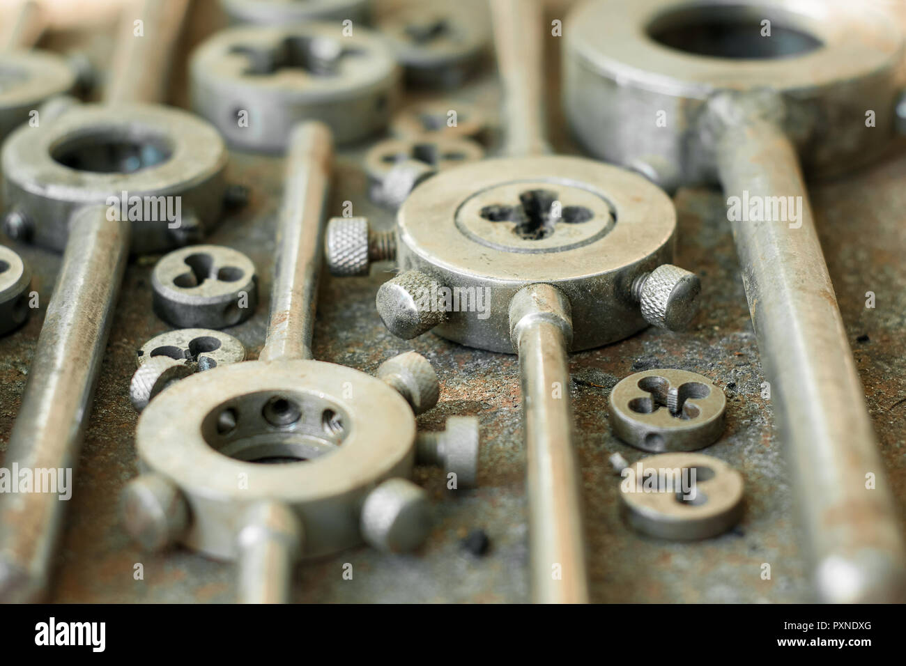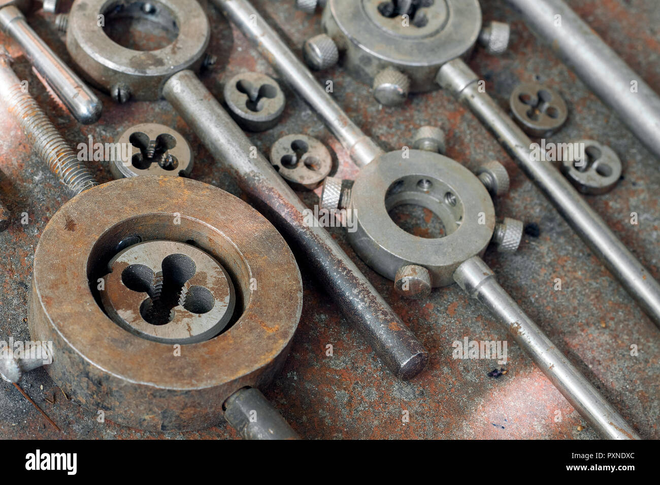 Threading dies on rusty metal surface close-up Stock Photo - Alamy