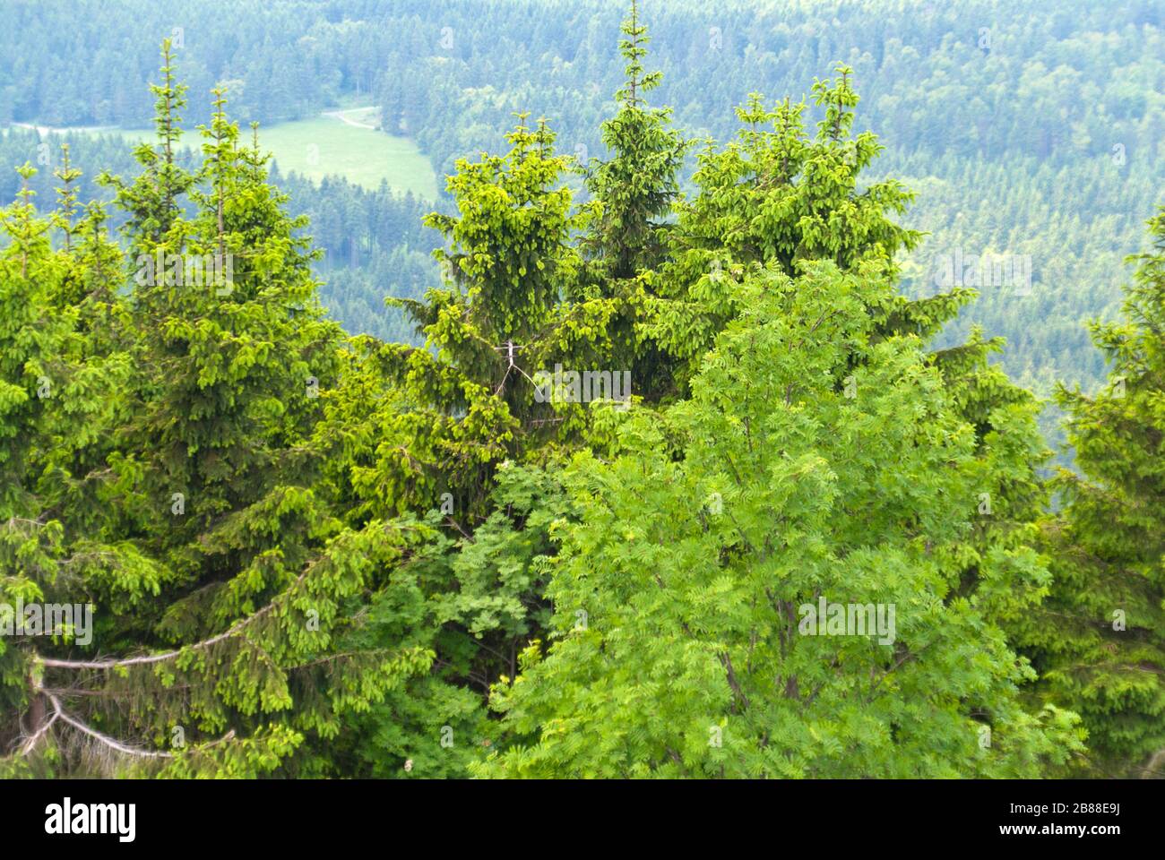 The trees of the Thuringian Forest, in the state of Thuringia, Germany ...