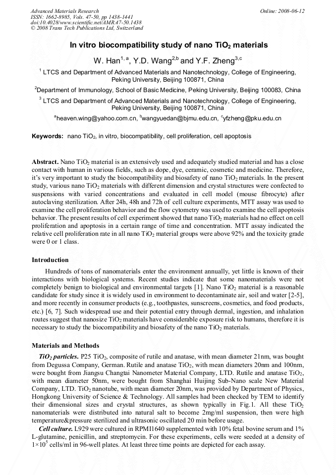 In Vitro Biocompatibility Study of Nano TiO2 Materials | Scientific.Net