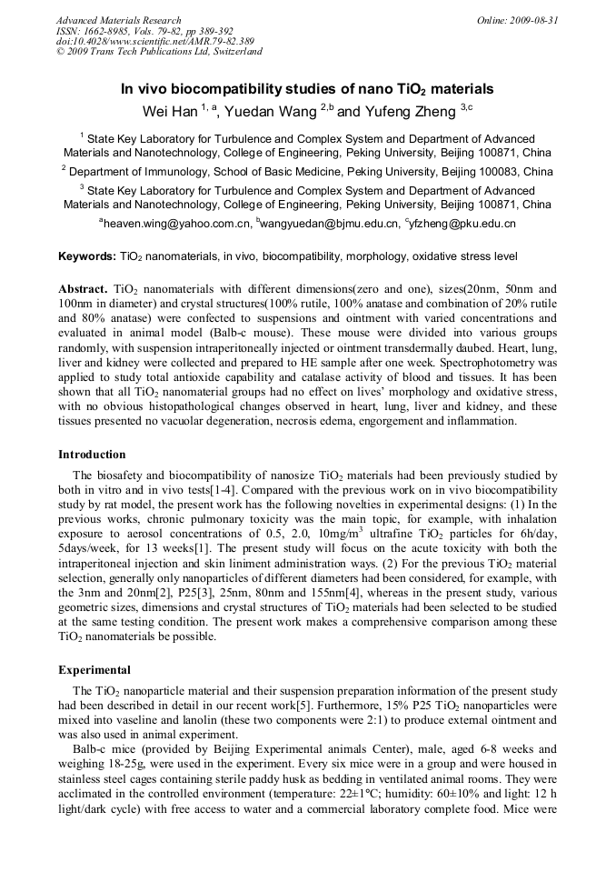 In Vivo Biocompatibility Studies of Nano TiO2 Materials | Scientific.Net