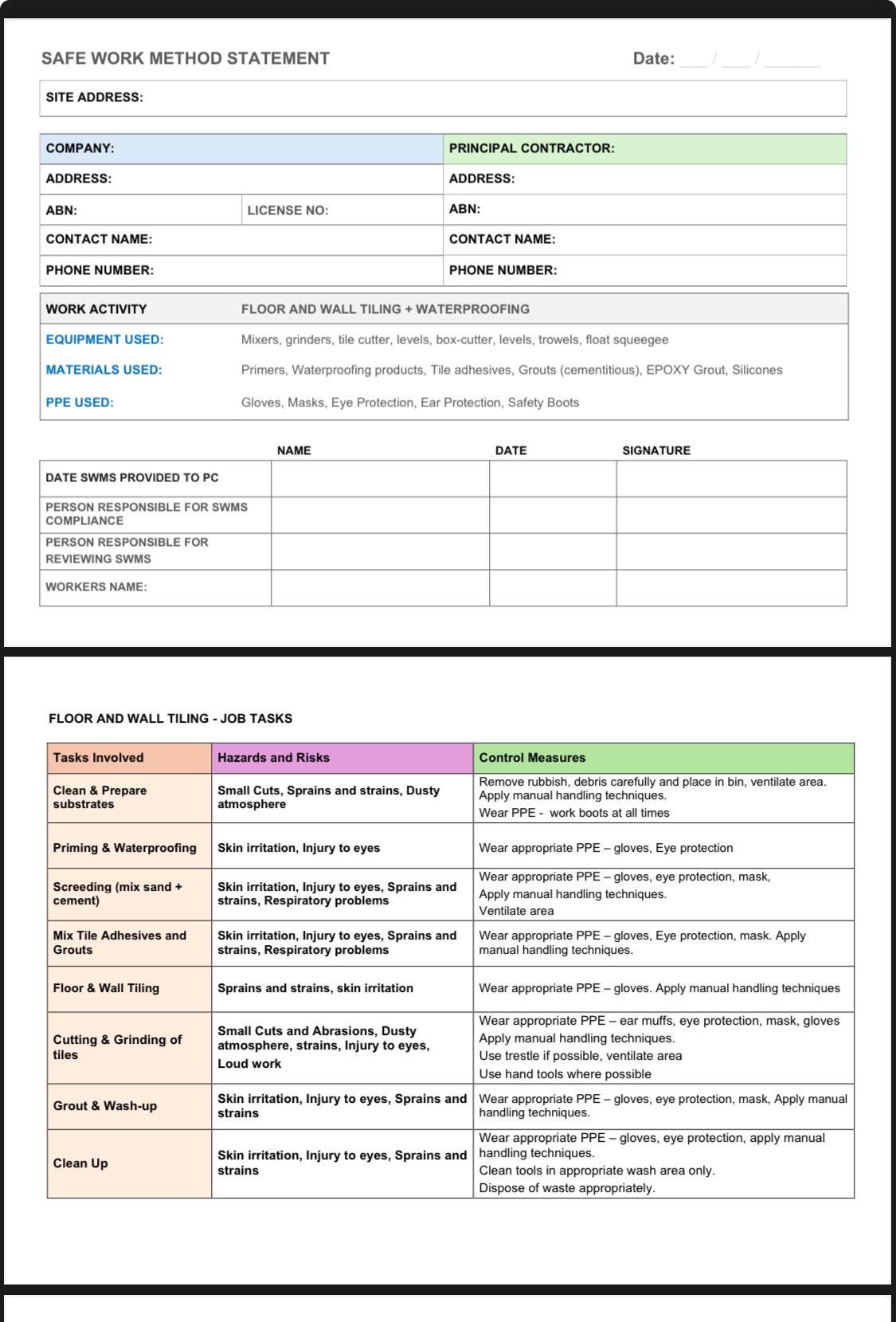 Tiling SWMS Template | Editable Safe Work Method Statement PDF | Job ...