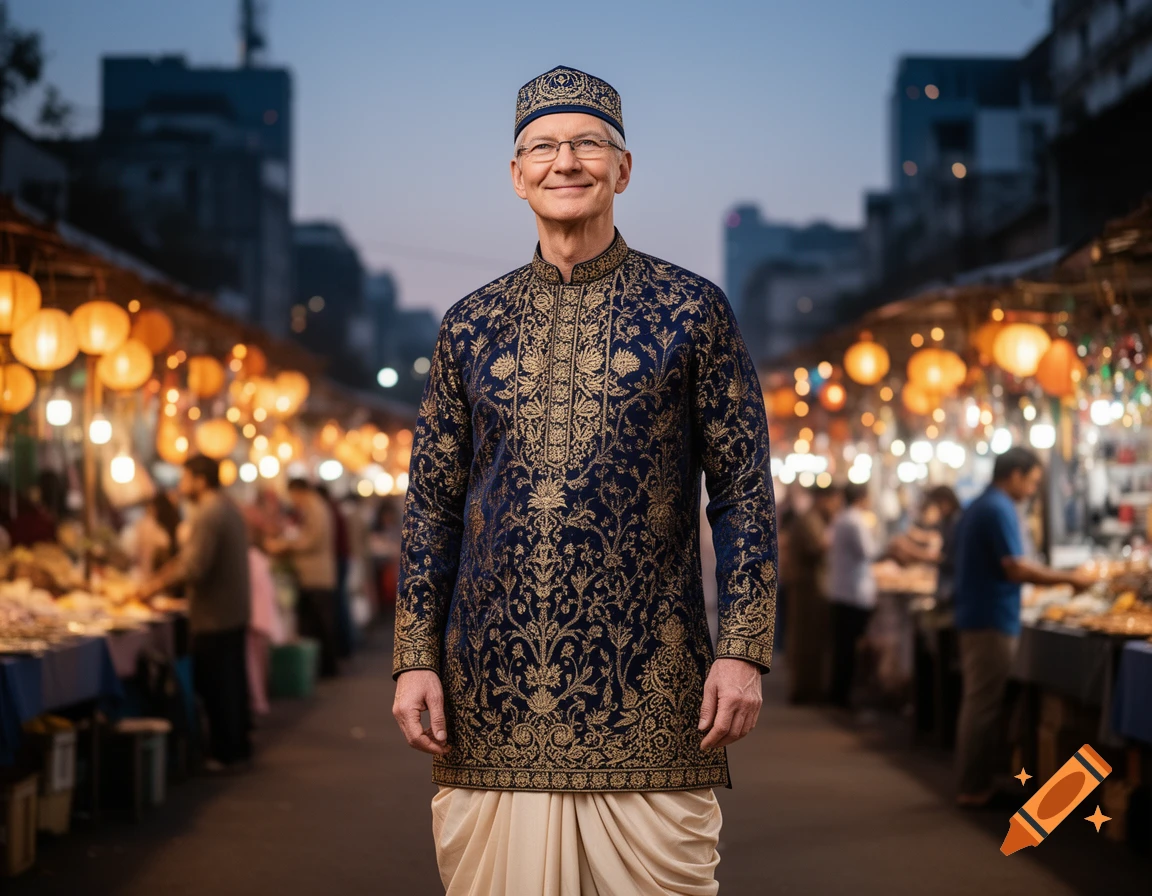 Tim Cook smiling in traditional blue and gold embroidered attire with a ...