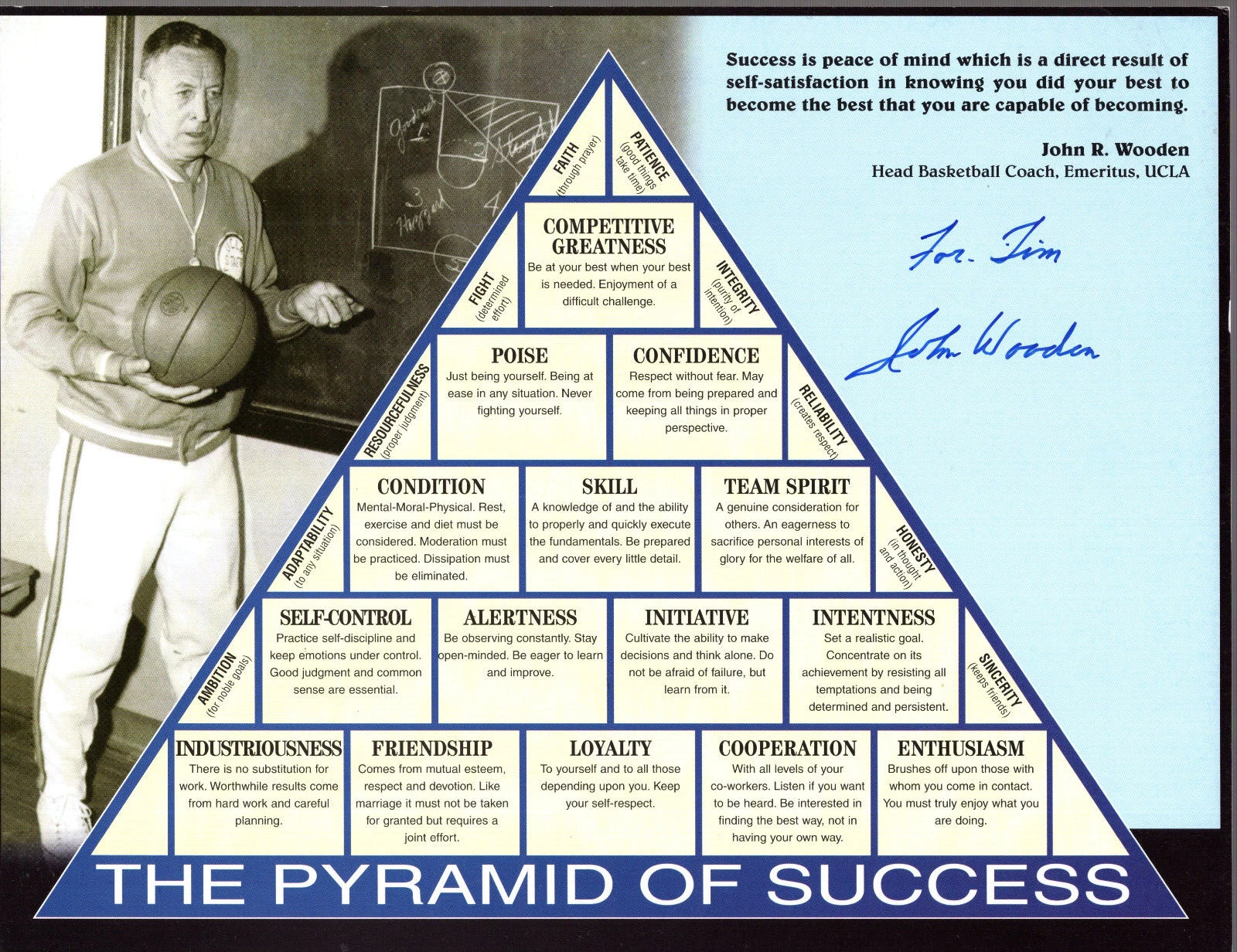 JOHN WOODEN HAND SIGNED 8x11 PYRAMID OF SUCCESS UCLA COACH FOR TIM JSA ...