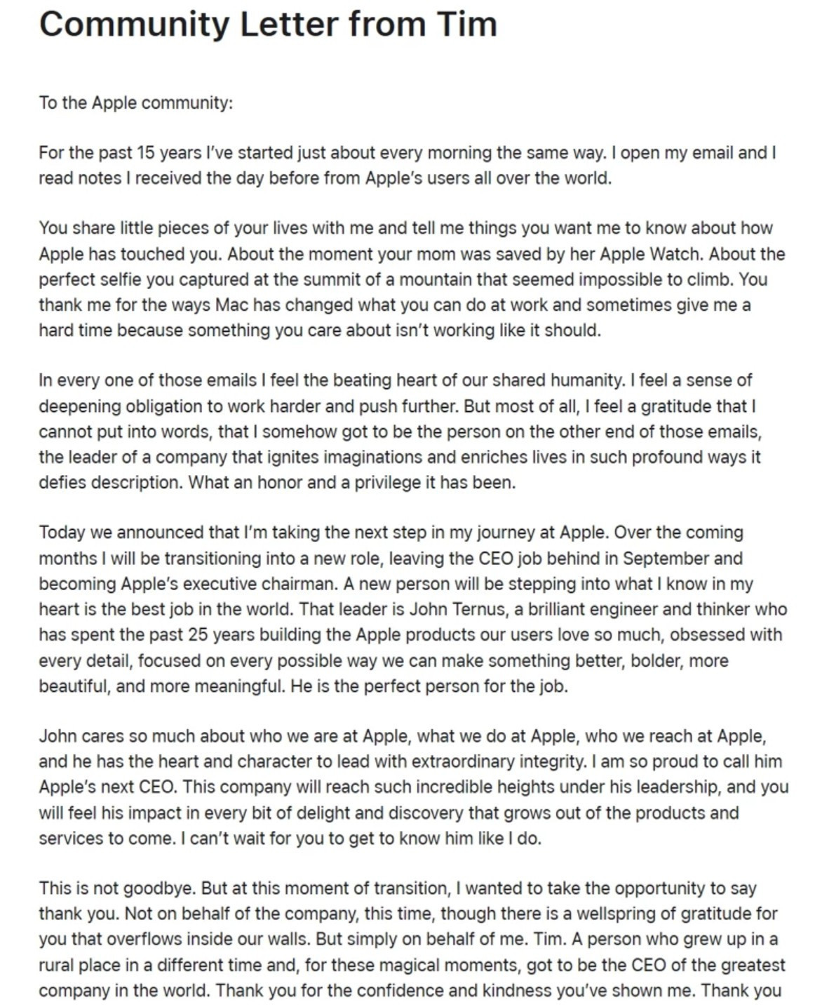 CEO'luğu bırakan Tim Cook'tan Apple kullanıcılarına mektup