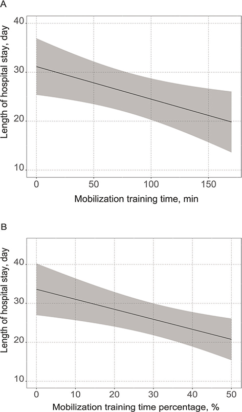 Scatter plot. Relation between hours of mobilization and length of stay ...