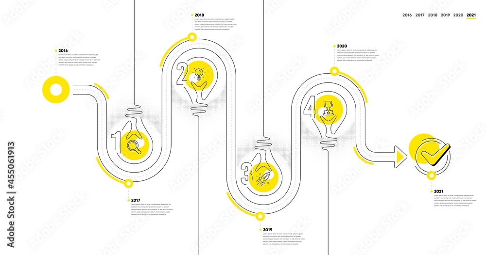 Business Infographic timeline with 4 steps. Lightbulb journey path ...