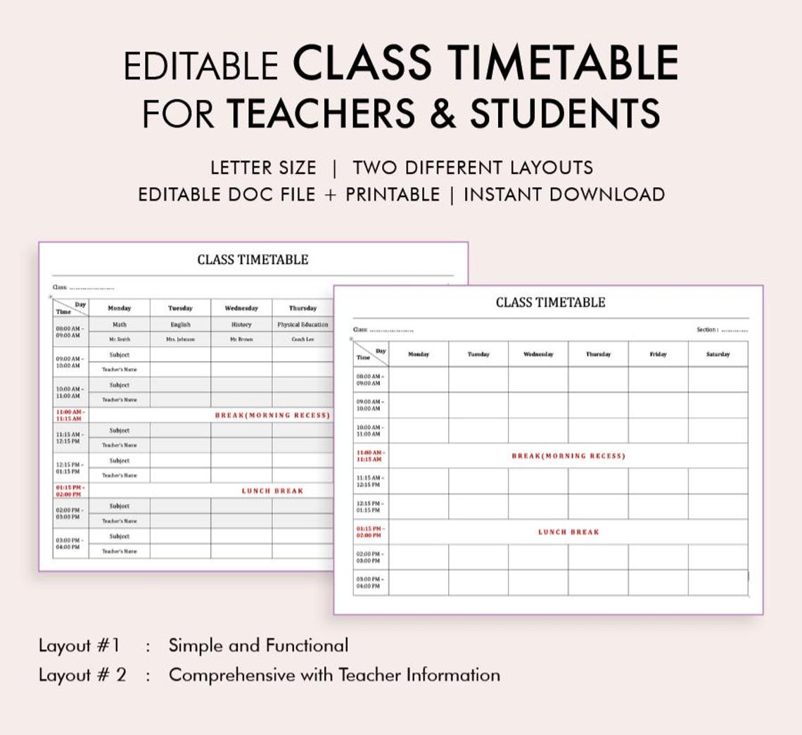Editable Class Timetable - Two Layout Options for Teachers and Students ...