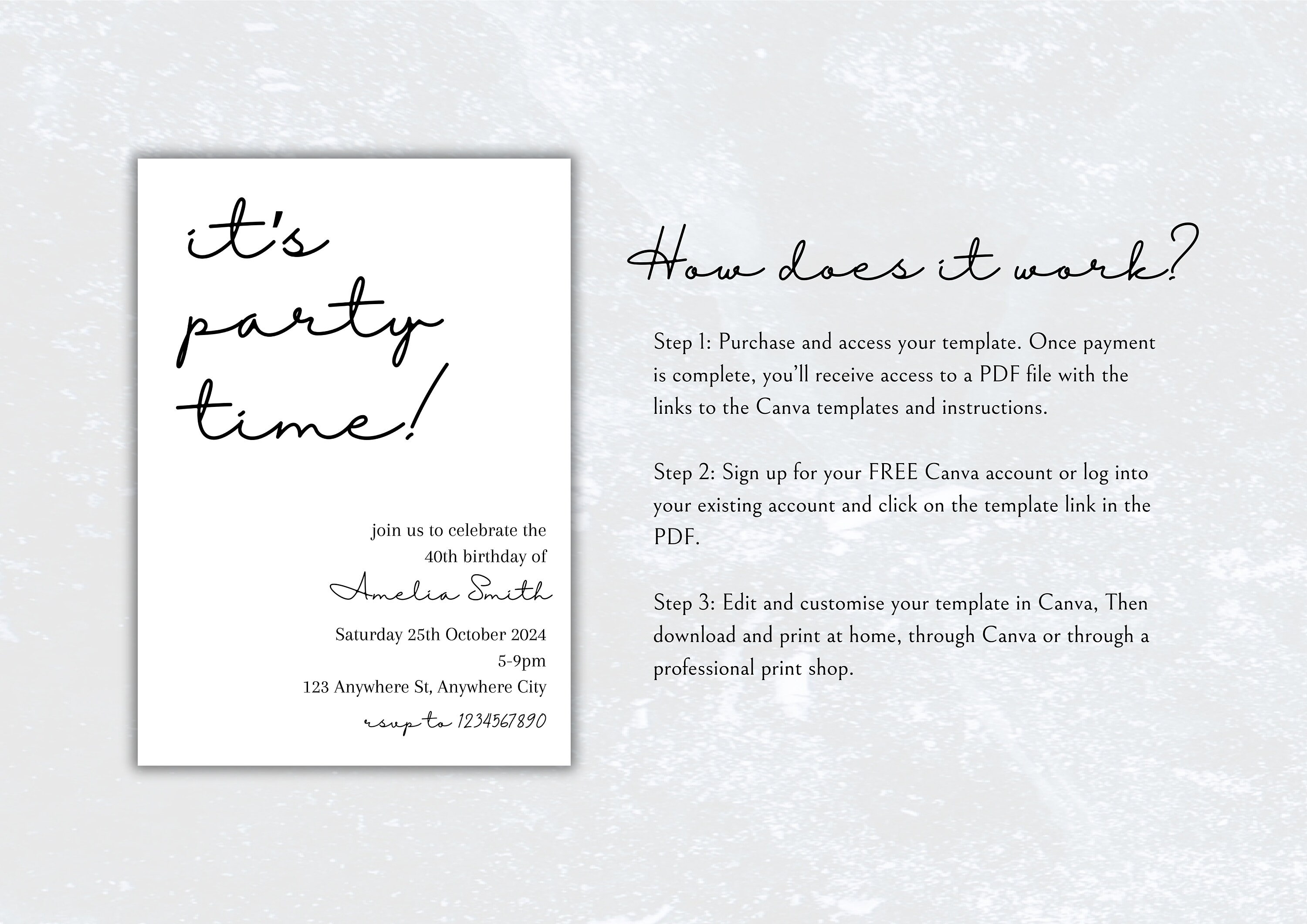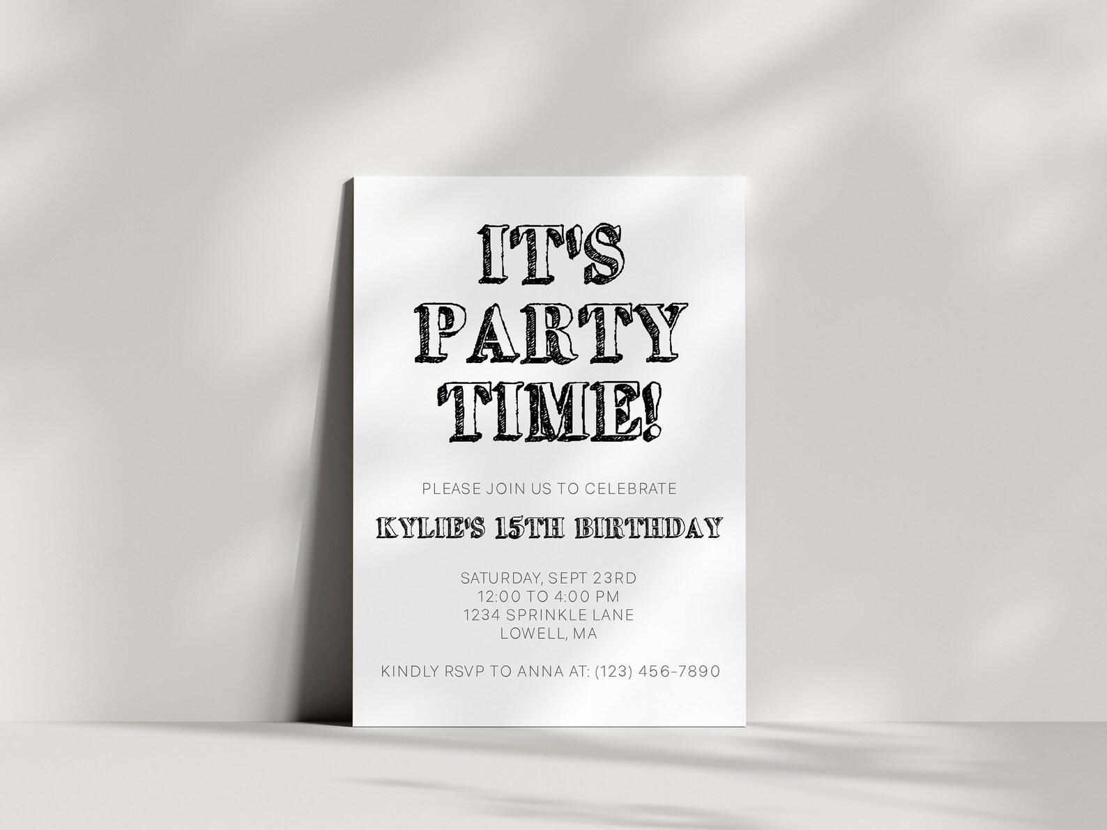 It's Party Time Birthday Invitation Template, Minimal Black and White ...