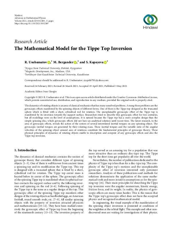 The Mathematical Model for the Tippe Top Inversion - Usubamatov - 2021 ...