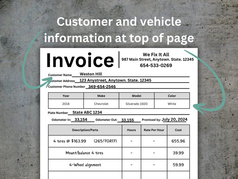Tire Service & Auto Repair Invoice Template, Tire Repair Order Form - Etsy