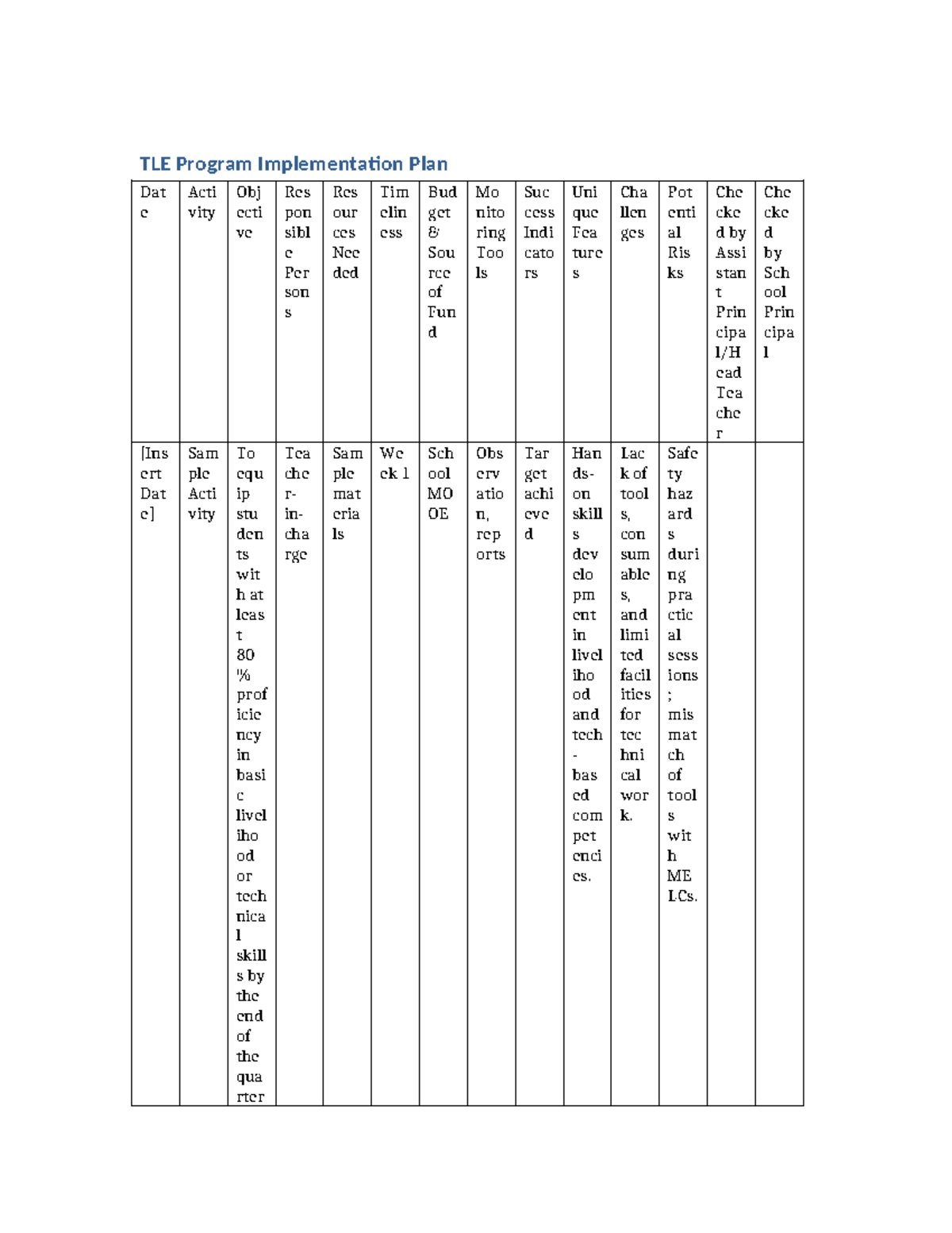 TLE Program Implementation Plans: Strategies for Student Proficiency ...