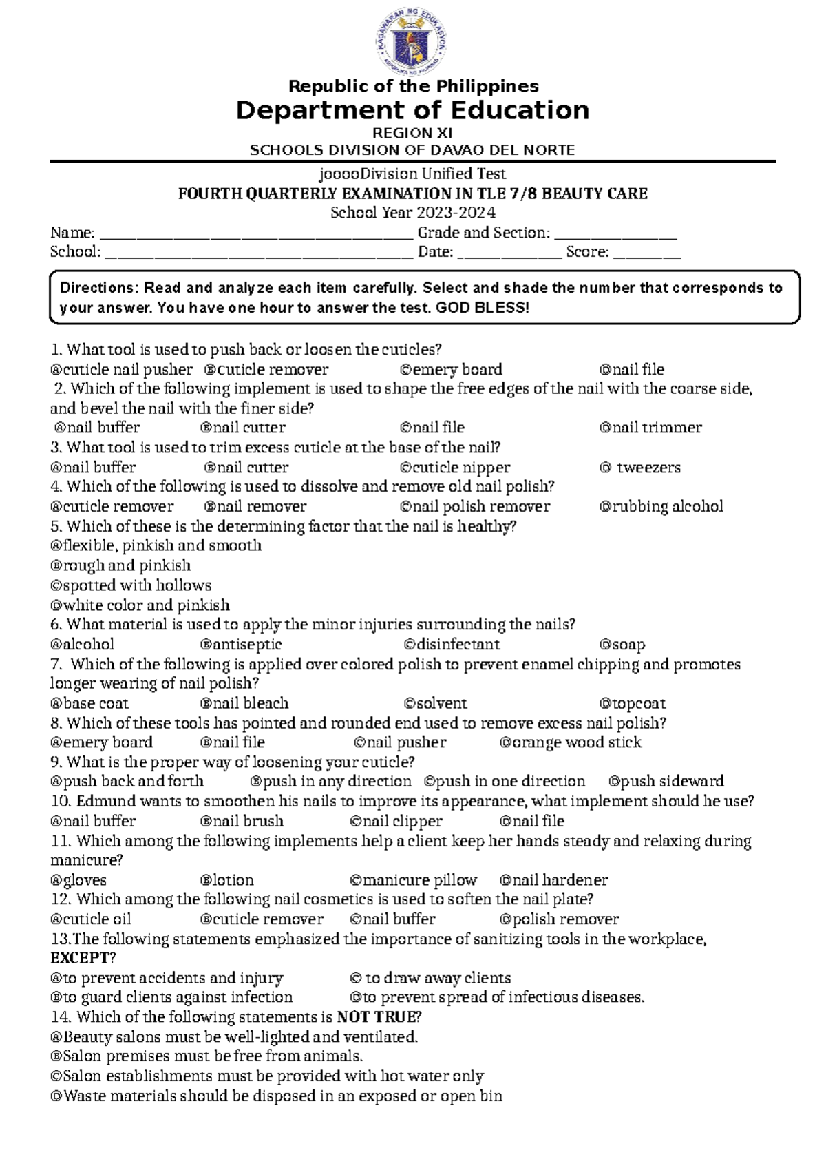 TLE 7 4TH QTR EXAMINATION IN BEAUTY CARE: Unified Test Guide - Studocu