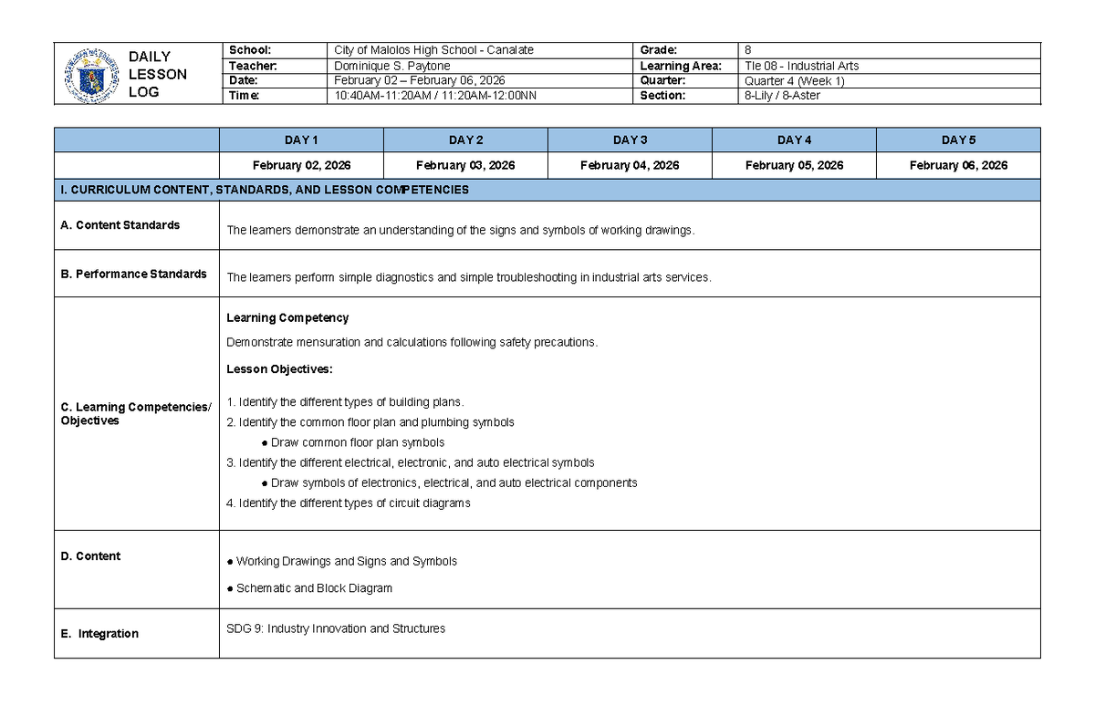 DLL TLE 8 Q4W1 - Daily Lesson Log for TLE 8: Building Plans & Symbols ...
