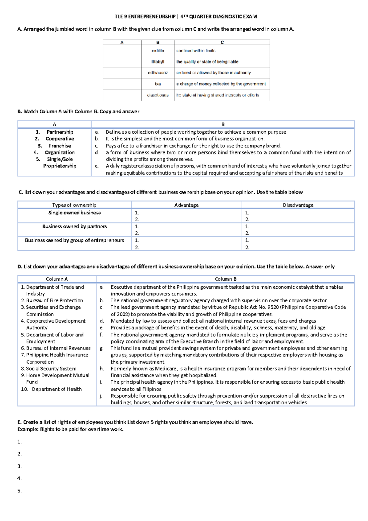 TLE 9 Entrepreneurship 4th Quarter Diagnostic Exam Guide - Studocu