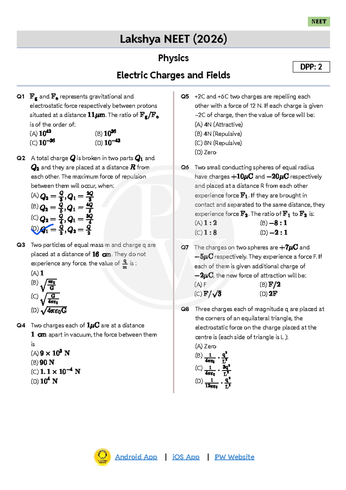 Electric Charges and Fields DPP 02 - Lakshya NEET 2026 - Studocu