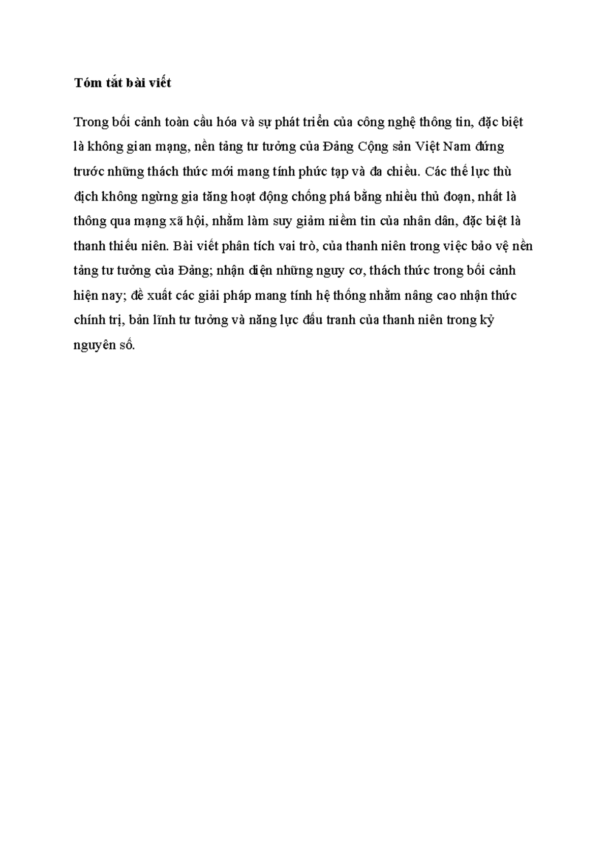 Tóm tắt bài viết: Vai trò của thanh niên trong kỷ nguyên số - 123 - Studocu