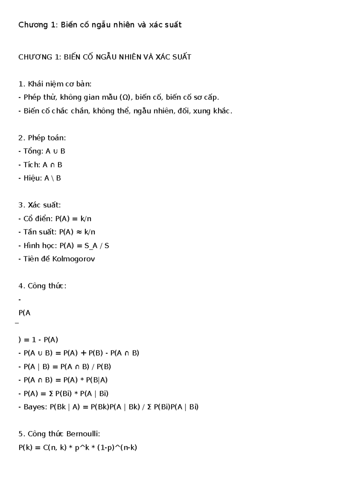 Tóm tắt môn học: Biến cố ngẫu nhiên và xác suất - Chương 1 - Studocu