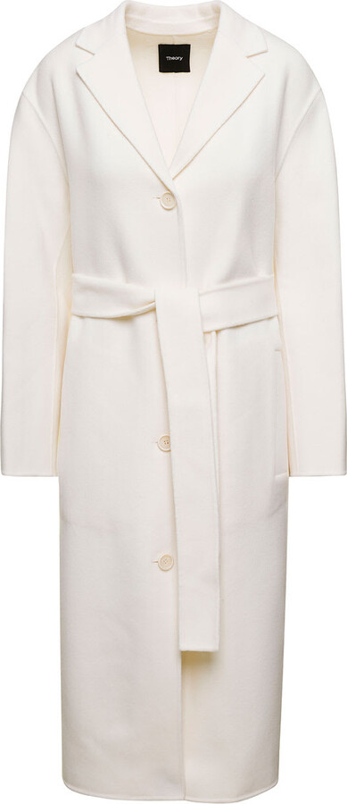 Theory White Relaxed Coat With Matching Belt And Tonal Buttons In Wool ...