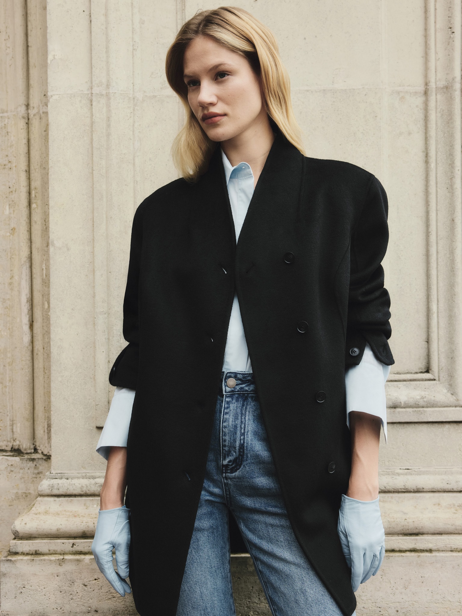 Cropped woollen coat with high collar and tonal buttons :: LICHI ...