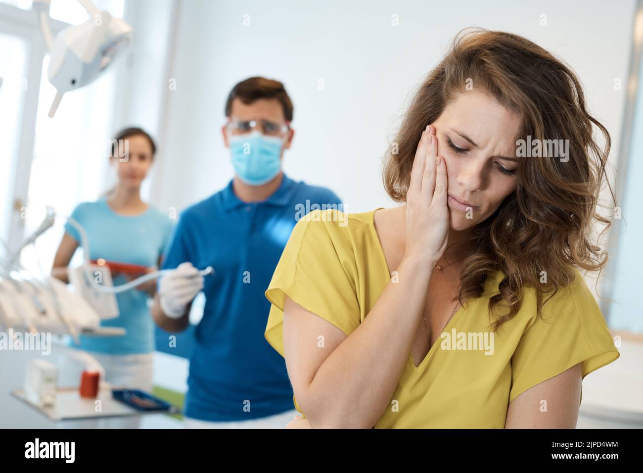 Woman patient feeling toothache touching cheek in dental clinic Stock ...