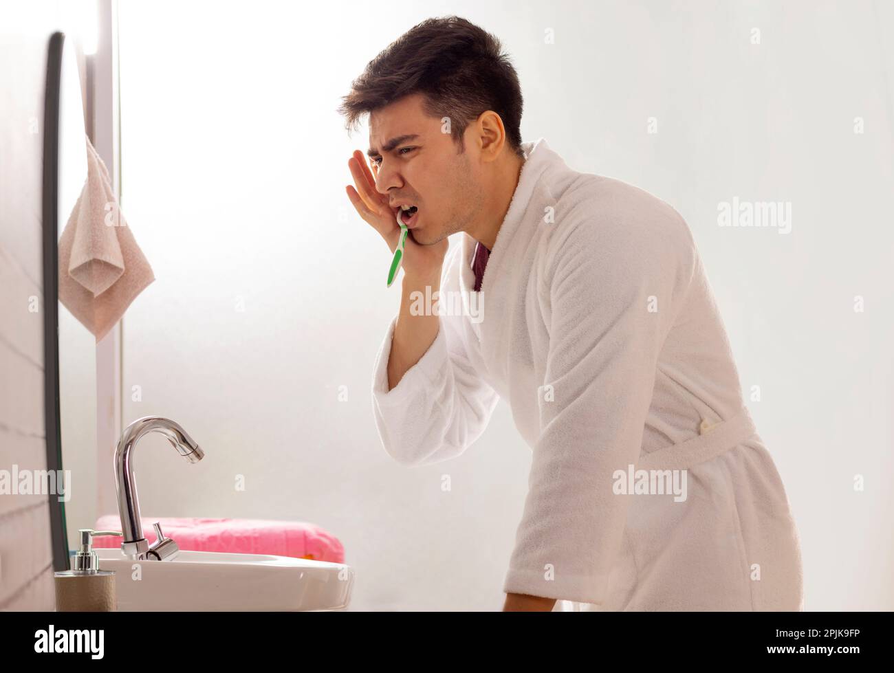 Young man suffering from toothache while brushing Stock Photo - Alamy