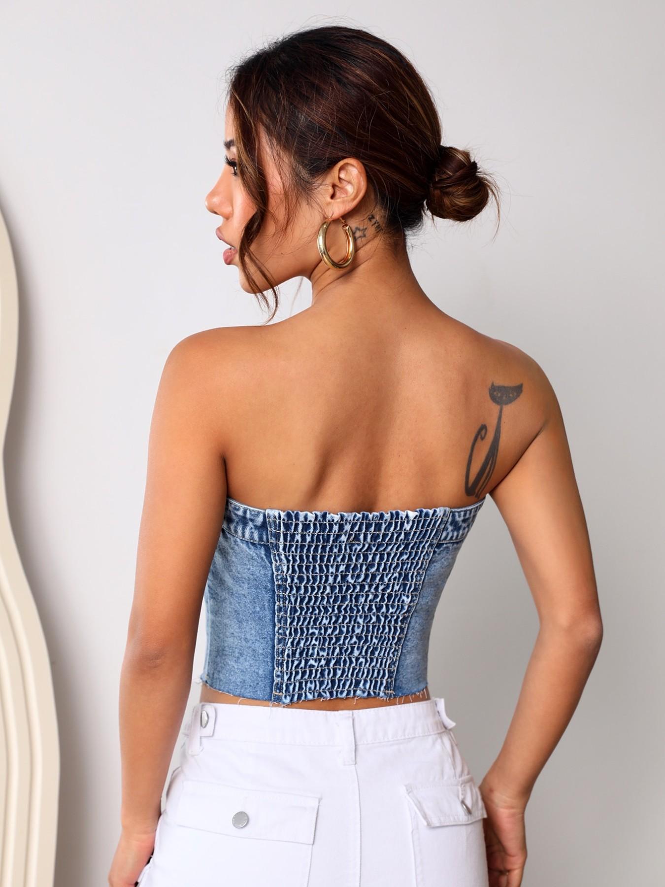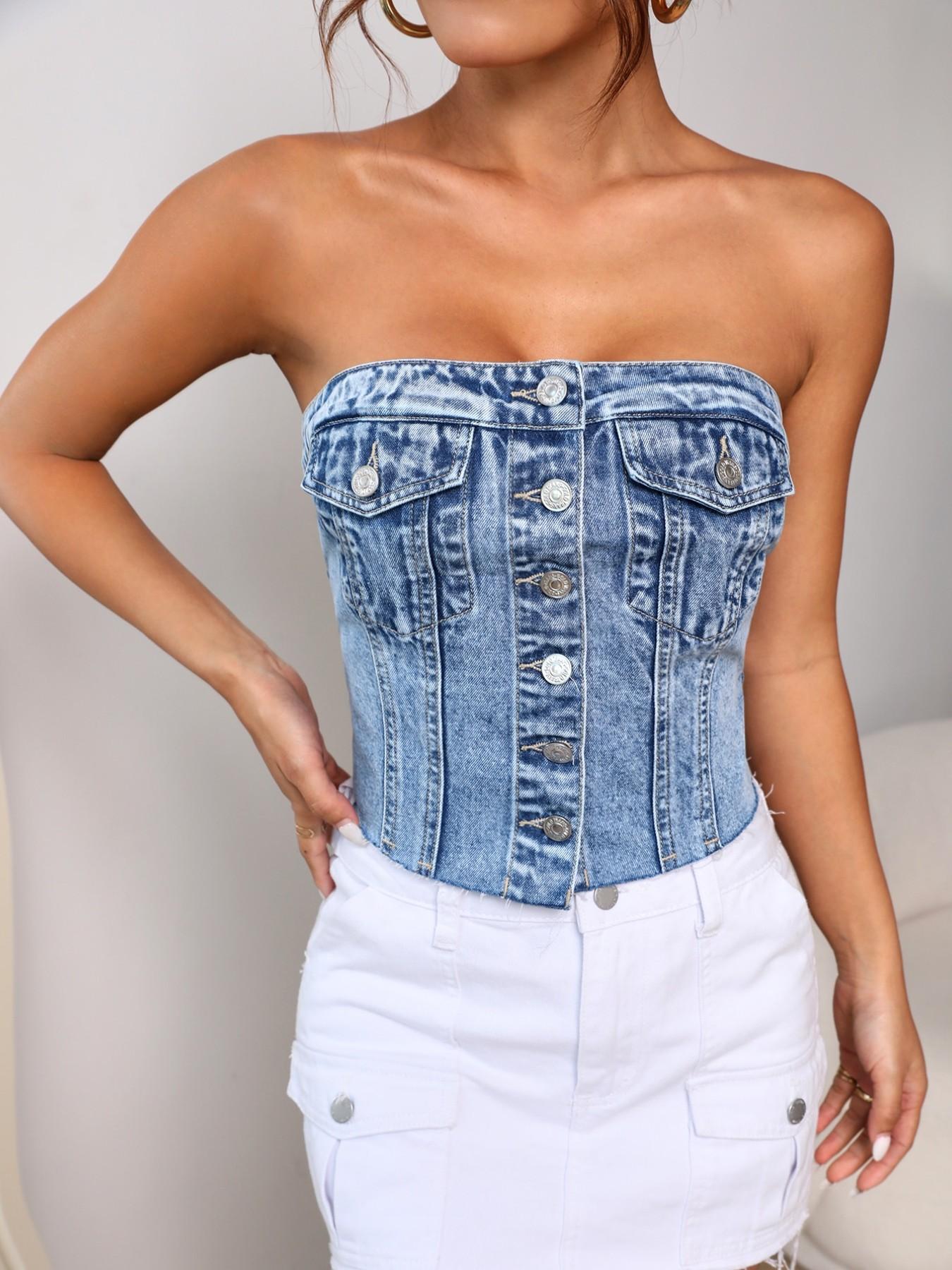 Women's Light Wash Denim Halter Top Waist Cincher Fitted Shirt, Button ...