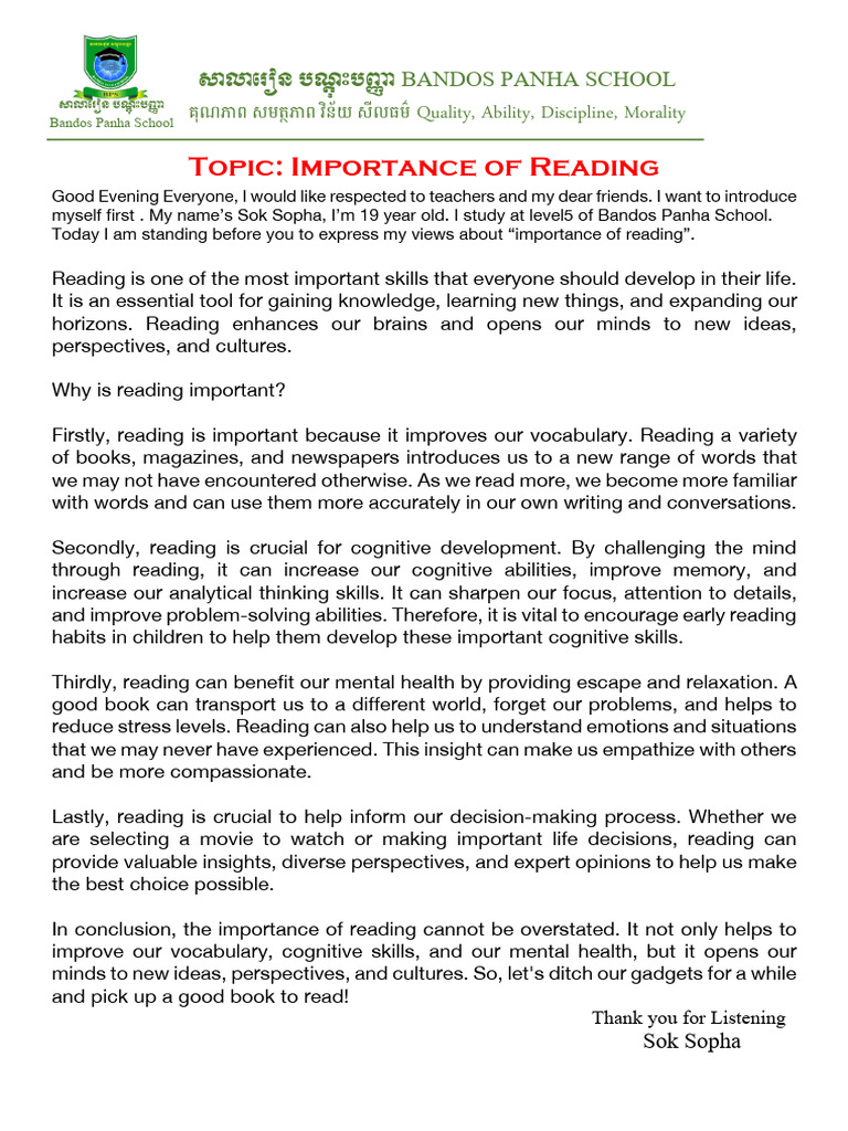 Topic - Importance of Reading | PDF | Mind | Cognition