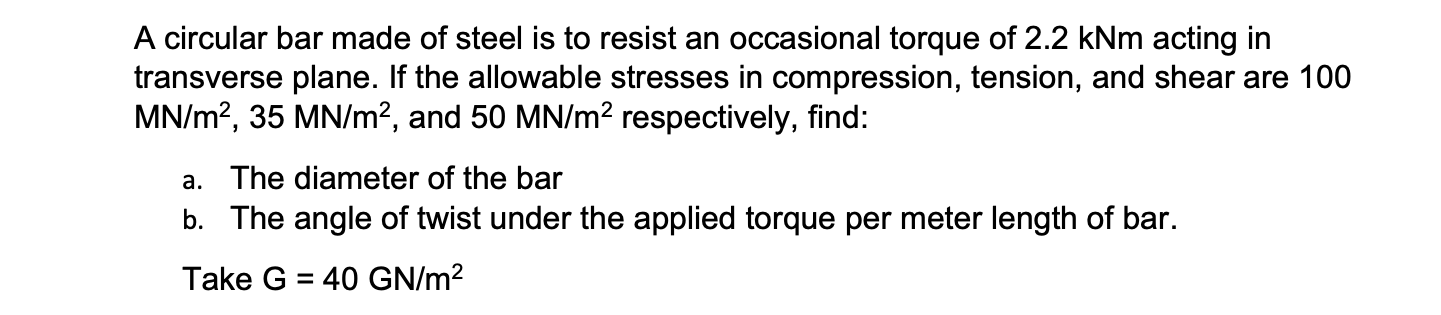 Solved A circular bar made of steel is to resist an | Chegg.com