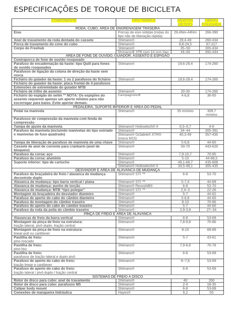 Especificações de Torque de Bicicleta | PDF | Parafuso | Engrenagem