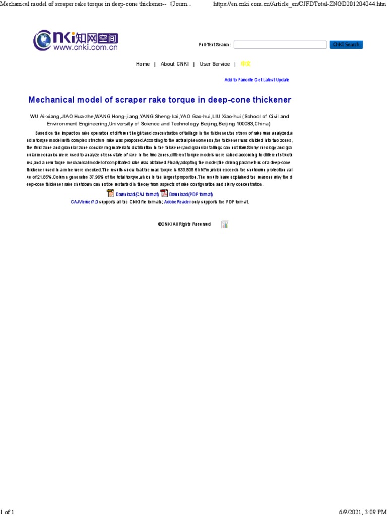 Mechanical Model of Scraper Rake Torque in Deep-cone Thickener ...