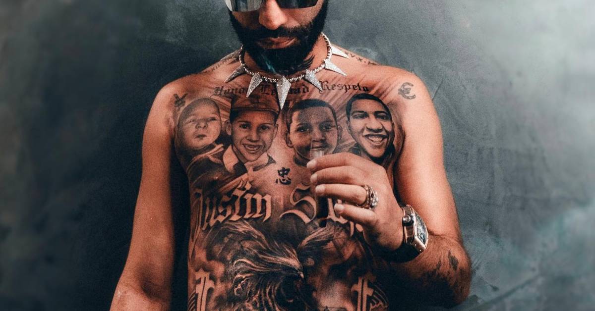 Arcángel's full torso tattoo done in black and grey