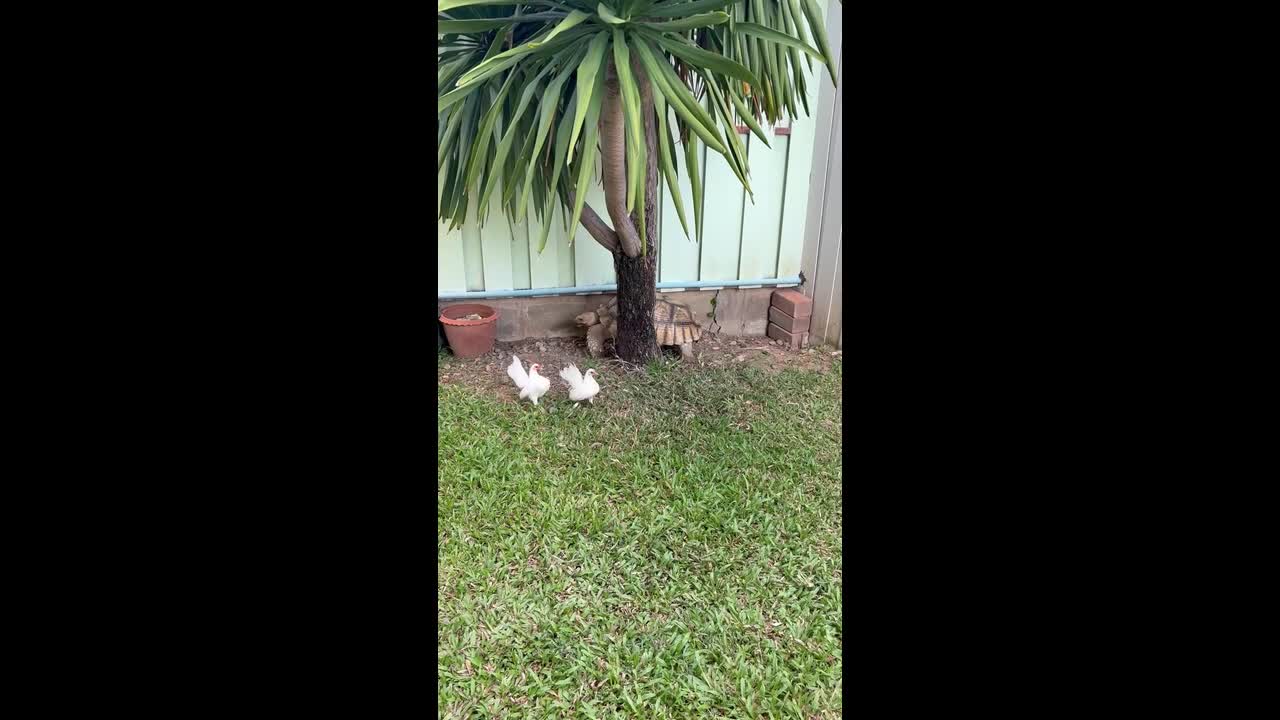 Tortoise has world's slowest chase as it tries in vain to catch chickens