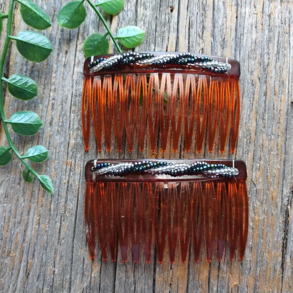 tortoise-shell beaded hair combs pair - Gem