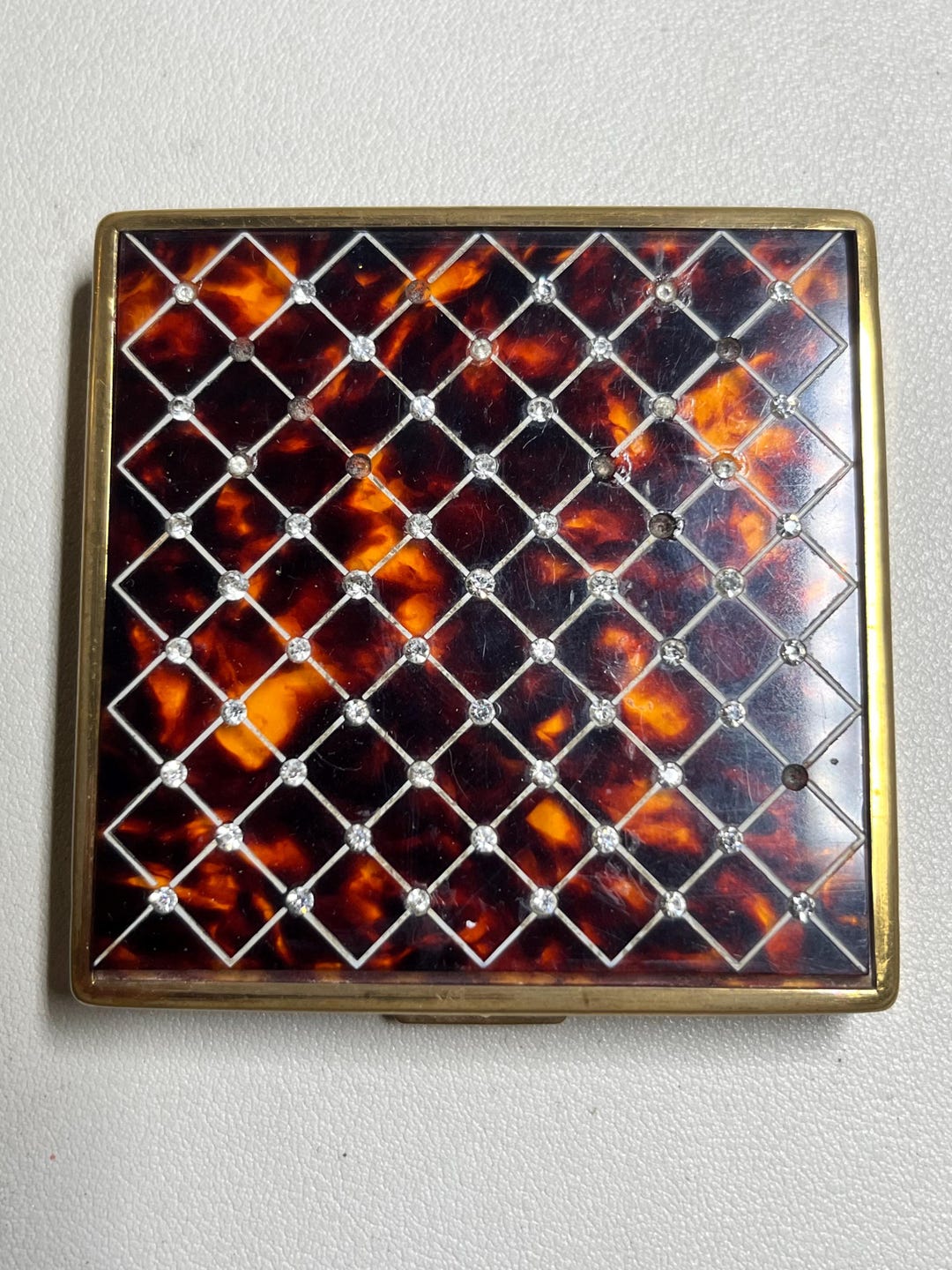 3" X 2 1/2" TORTOISE SHELL ENAMEL AND GILT POWDER COMPACT - newmanhire