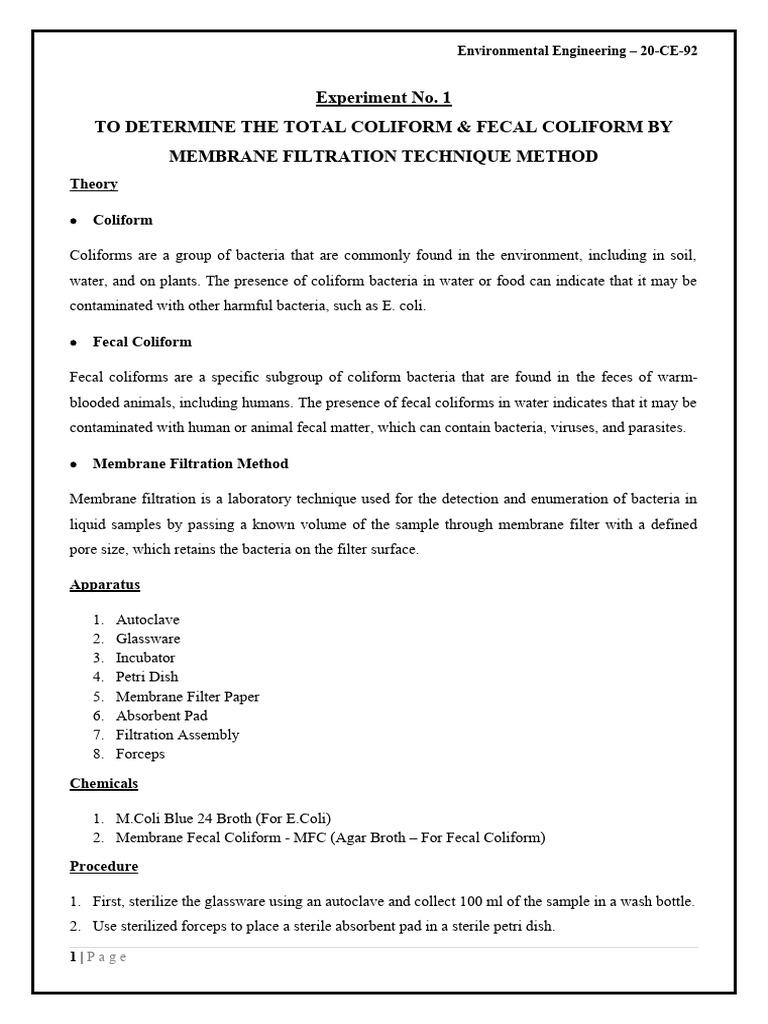 Experiment No. 1 To Determine The Total Coliform & Fecal Coliform by ...